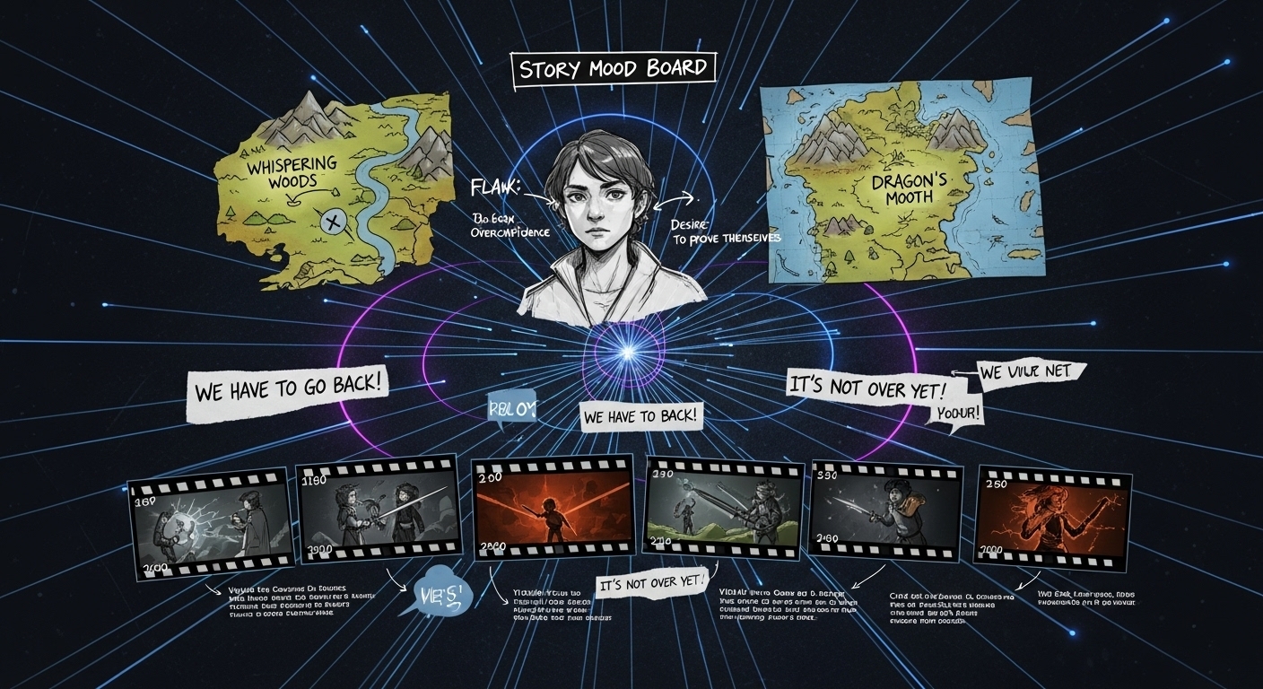 Image Prompt: A hyper-detailed digital art of a story’s mood board, featuring: a central character sketch with notes on their “flaw” and “desire,” a map of a fantasy location, several “keyframe” storyboard sketches in a cinematic style, and snippets of dialogue, all connected by glowing lines on a dark background.